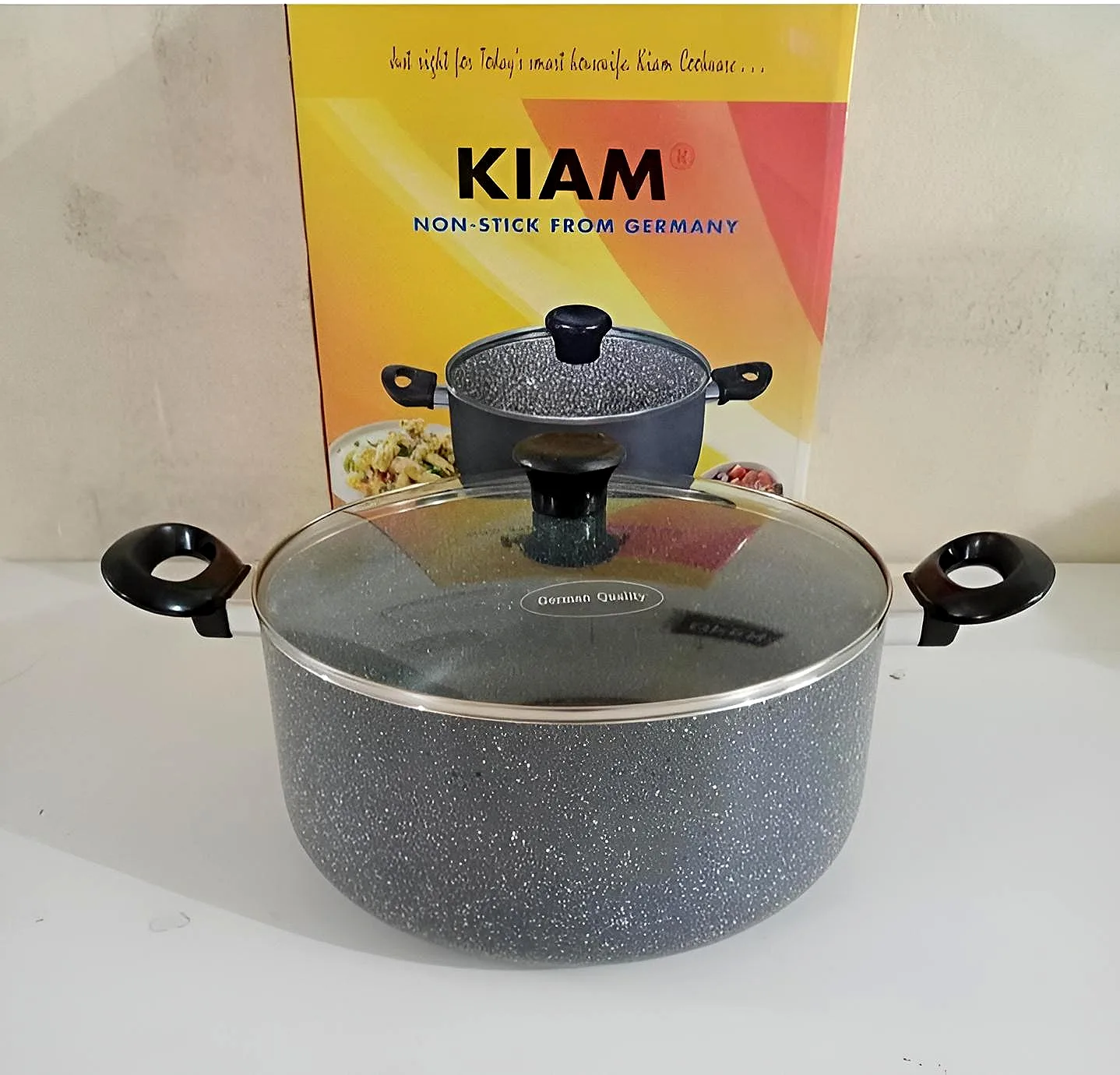 The product in the image is a Kiam Marble Coated Casserole with a glass lid.